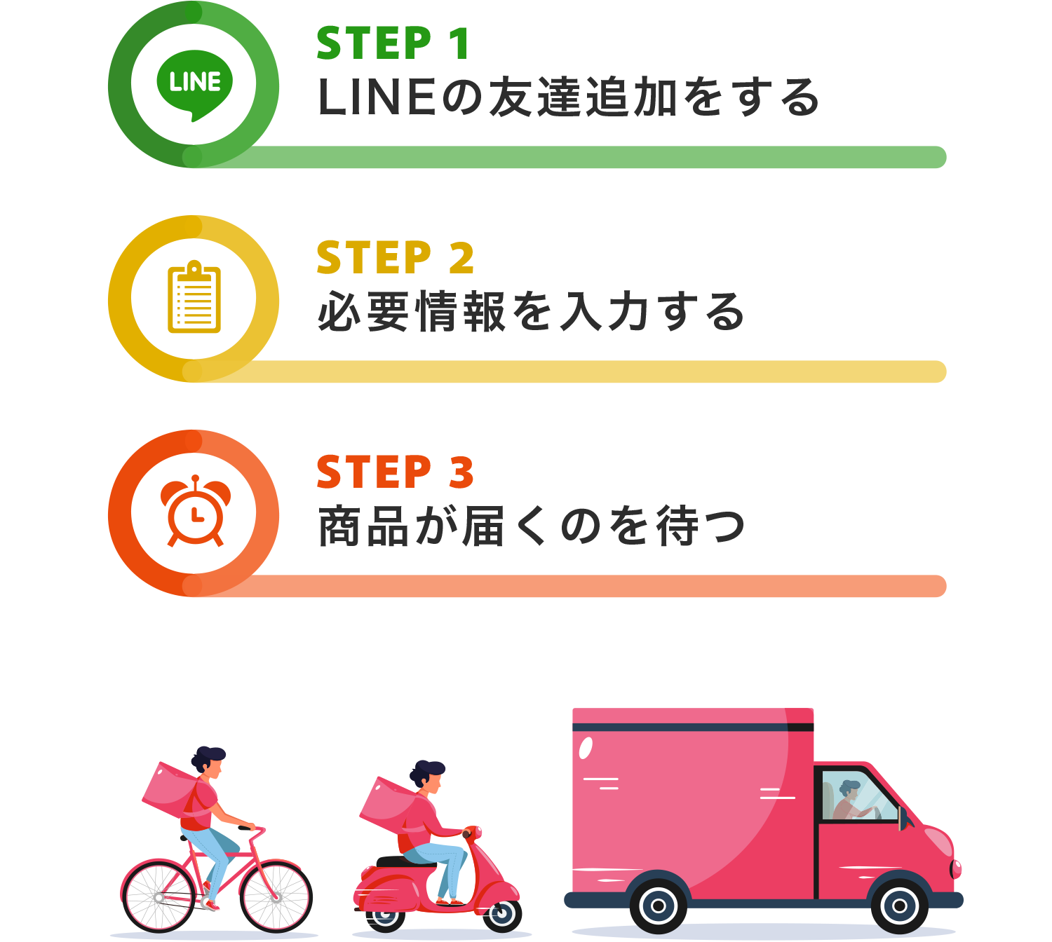 買い物くんの買物代行とはお客さまの欲しい商品を手に入れ、ご指定の場所にお届けするサービスです。時間がない方や買い方が分からない商品がある場合などにご活用ください。しかも、難しい登録などはなく簡単な3ステップで完了です。